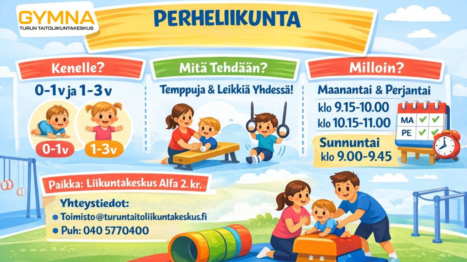 Gymnan perheliikunnassa harjoitellaan liikunnan perustaitoja leikkien kautta turvallisen ja tutun aikuisen kanssa. Tunneilla opetellaan kehon osien nimiä ja harjoitellaan liikkumistaitoja, välineenkäsittelytaitoja ja kehonasentoja. Perheliikunta kohottaa sekä aikuisten että lasten kuntoa samalla kun se on hauskaa perheen yhteistä aikaa.